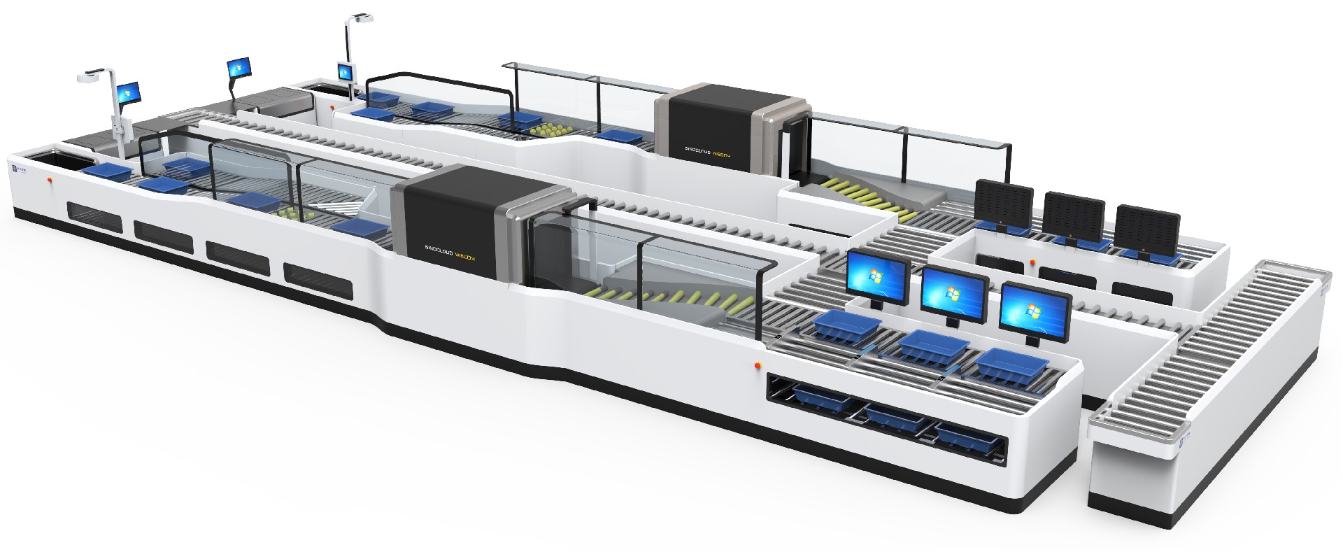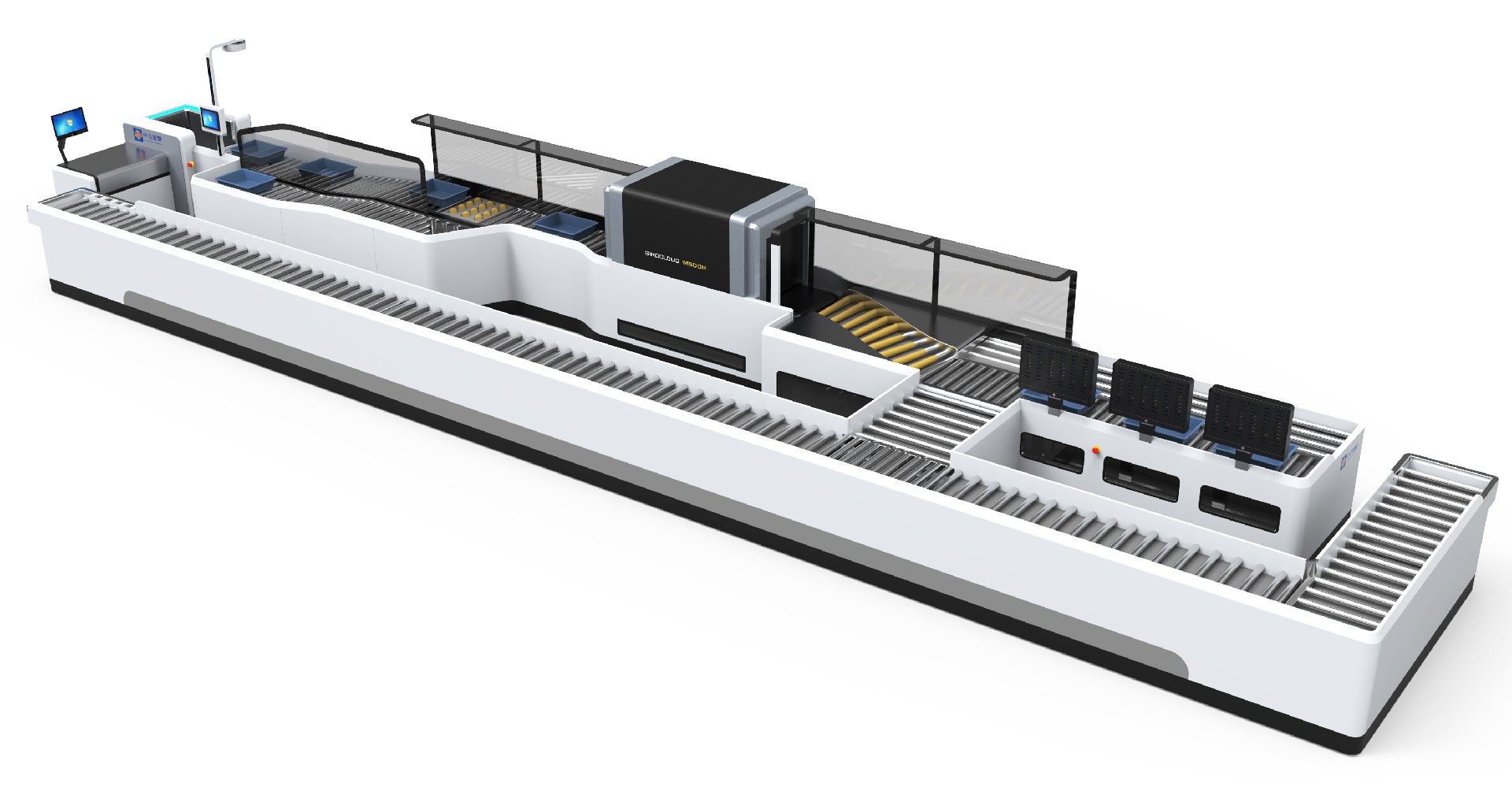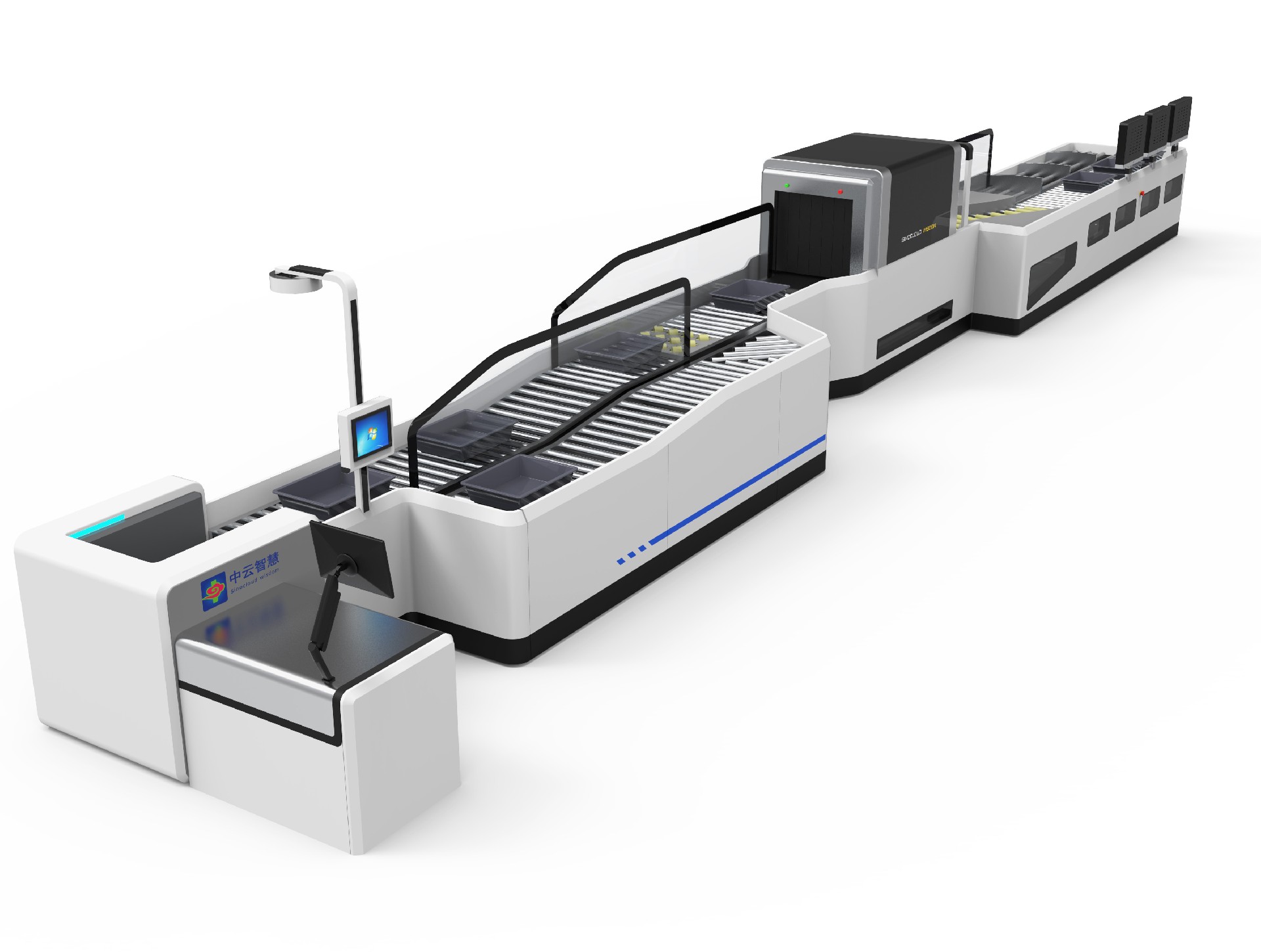It is the security check for hand luggage. The system includes the automatic identification of passengers, identification documents, and luggage. It also functions as information binding, the connection between passenger and luggage. The system is equipped with detection of empty basket and returning line, solving the problem of manual verification errors in traditional channel. The efficiency of a single channel can reach 260 people per hour at its peak. Additionally, its equipped centralized image recognition shorten the image recognition time to 2-3 seconds per piece.